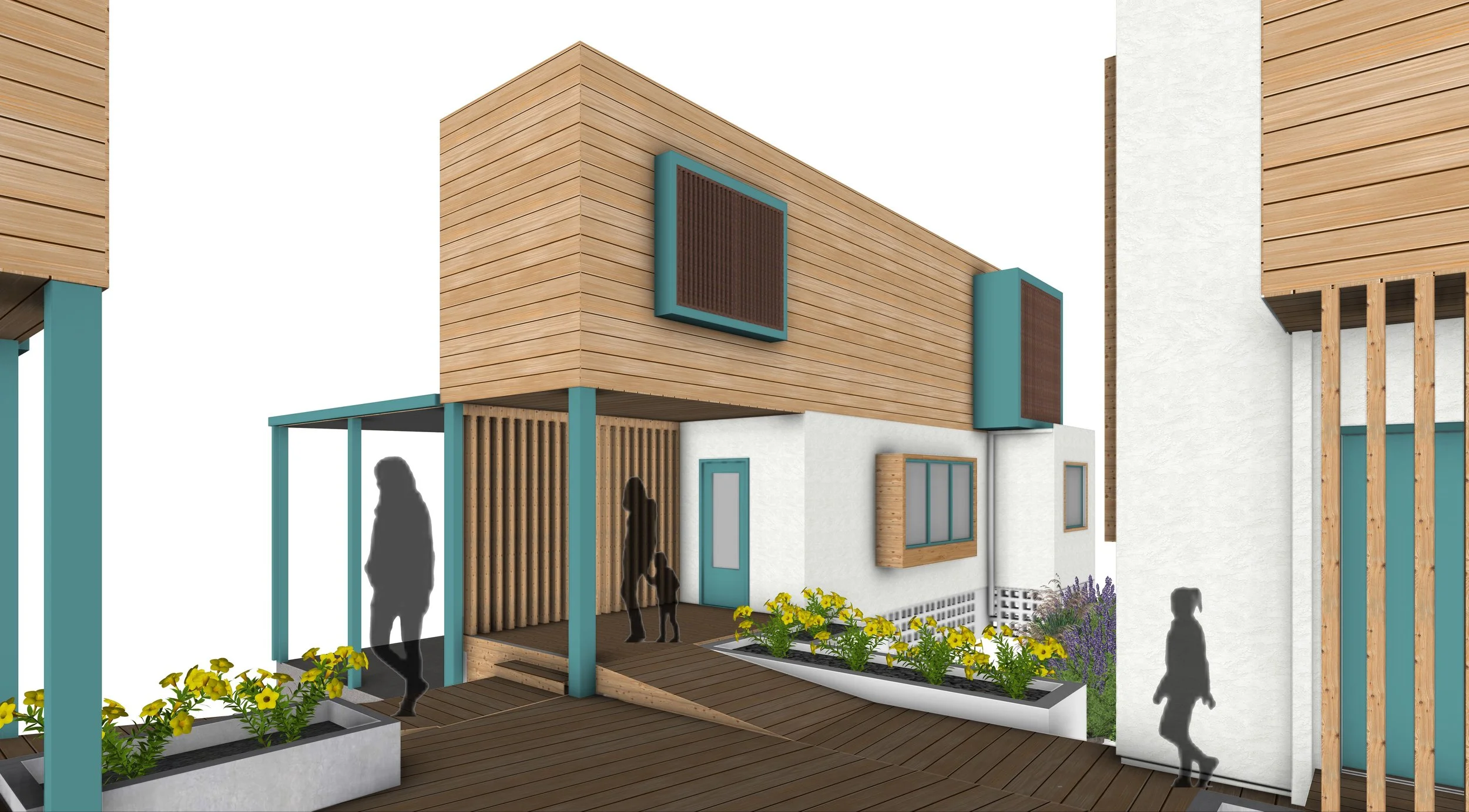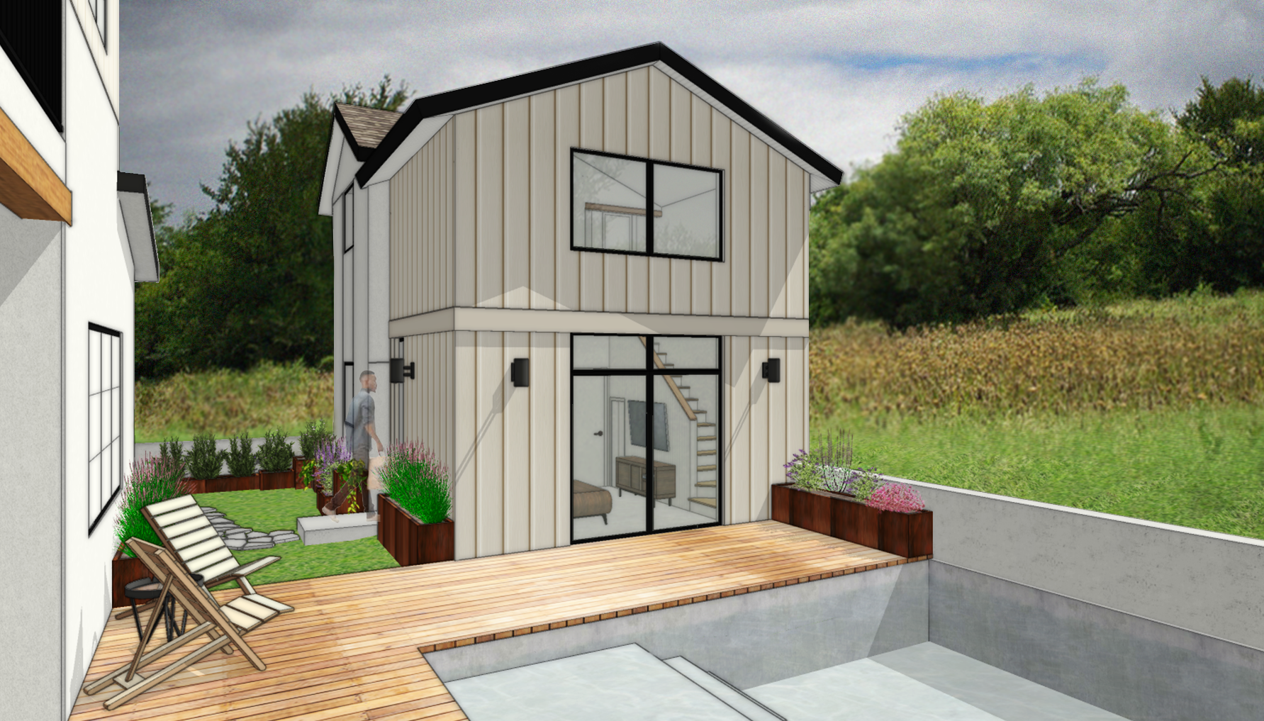 Med Modern Loft unit b garden with people-web.jpg